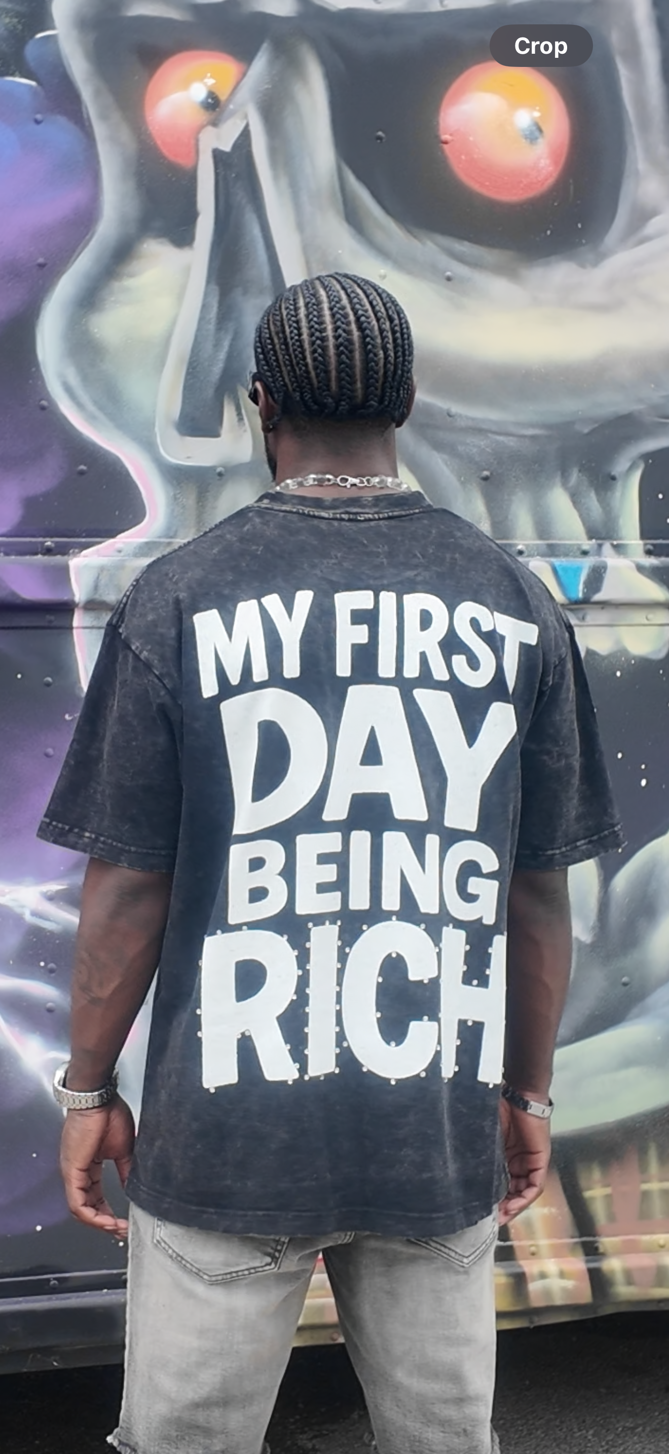 Back Reads: “My First Day Being Rich” in rhinestone-accented lettering.