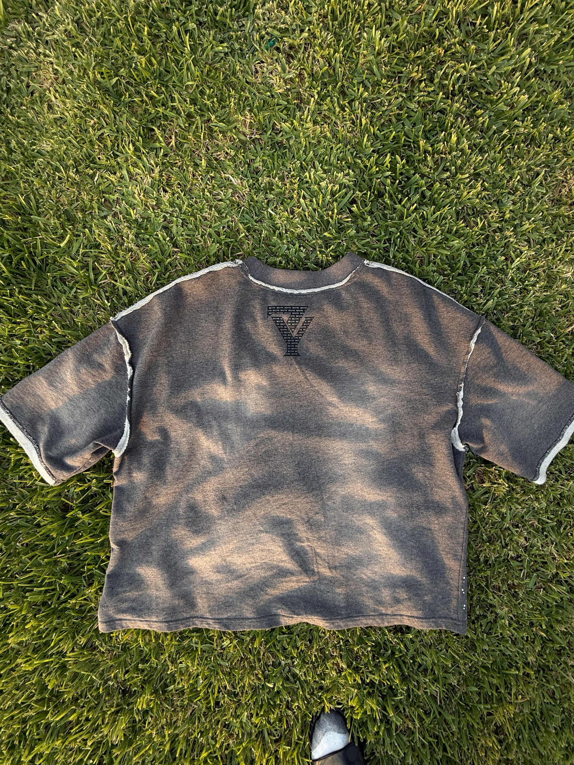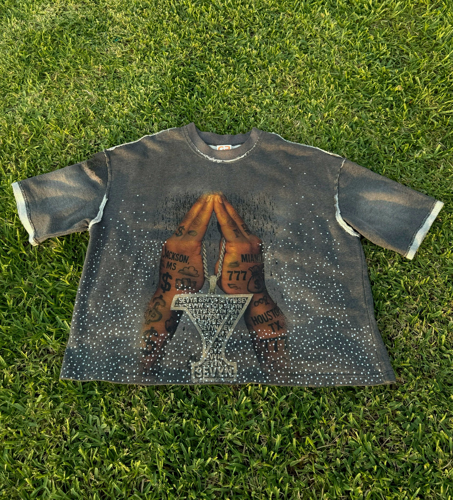 | A wearable prayer. Two tattooed hands, cities inked across the arms, meet in a plea of gratitude and hunger. This design is surrounded by subtle rhinestones and anchored by the SEVYN 7. For those who pray, hustle, and grow. |